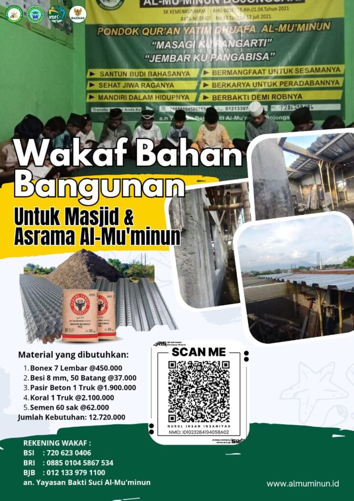 Assalamu’alaykum Sahabat Mu’min, saat ini kami memberanikan diri untuk kembali menawarkan Wakaf Bahan Bangunan untuk Pembangunan Masjid dan Asrama Al-Mu’minun yang sempat berhenti 3 bulan lamanya karena kurang dana.